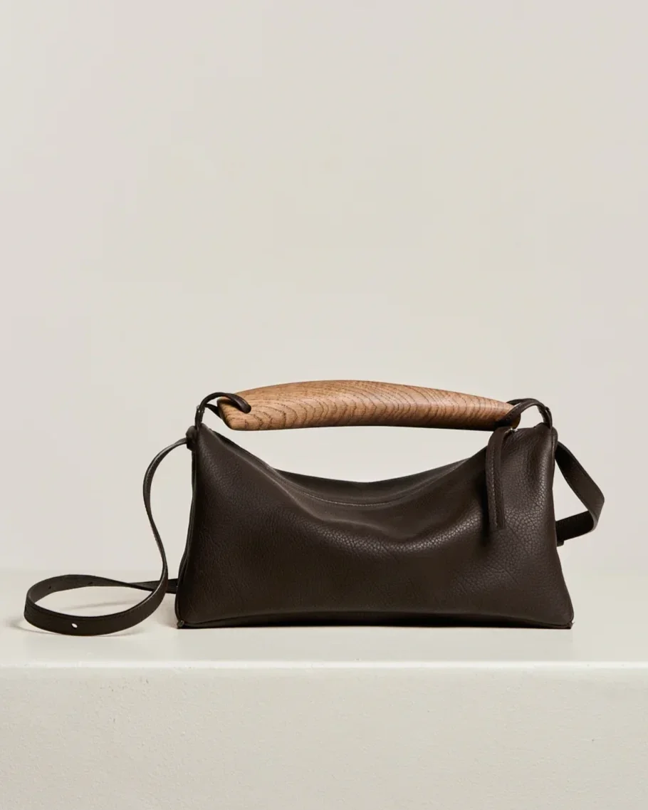 The Ensis bag is the result of a collaboration between Lies Mertens and Jonas Van Put, combining the precision of leatherworking with the sculptural approach of furniture design. Following the Oyster bag, this first edition of 30 numbered pieces introduces a new chapter in our Shell Collection. Its wooden handle, crafted from Belgian oak and individually hand-filed, was inspired by slender form of a razor clam, also known as Ensis. The bag itself is formed from two sculpted leather halves coming together like a closing shell. It is crafted in soft calf marine blue leather, with a special edition in Crispy calf, a rare leather achieved by shrinking the hide to create a structured effect and suede-like matte finish.
